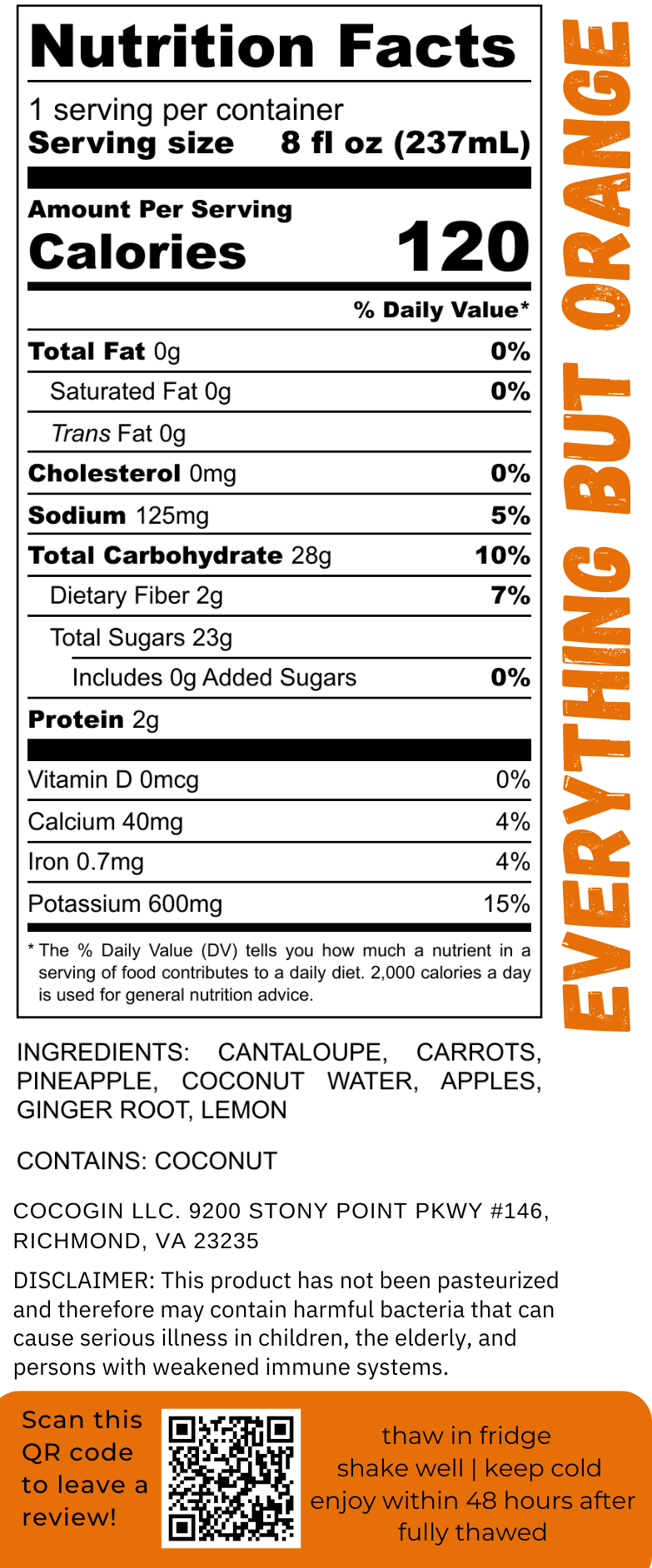 Cantaloupe hydrates and replenishes with vitamin A, C, potassium, and zinc — essential for healthy skin and immune function. Carrots and apples deliver a dynamic mix of nutrients that support vision, heart health, and blood sugar balance. Pineapple brings anti-inflammatory properties and bromelain for digestive support, while lemon provides a burst of vitamin C and acts as CoCoGin’s natural preservative. Coconut water restores electrolytes and improves hydration, and ginger rounds out the blend with powerful anti-inflammatory and digestive benefits.